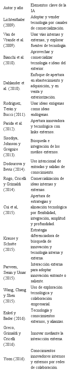 Por lo anterior, debido a la confusión existente en la definición, es necesario abordar la concepción de la innovación abierta de diferentes estudios teóricos y empíricos, y analizar como dicho concepto ha ido cambiando y complementándose a través del tiempo, pues por lo reciente del tema, no se ha concretado una definición homogénea, ni un consenso general en su definición (Dahlander et al., 2010; Elmquist, Fredberg y Ollila, 2009). Por lo tanto, a continuación se presenta la Tabla 1, en la cual se muestran los elementos clave de la definición.