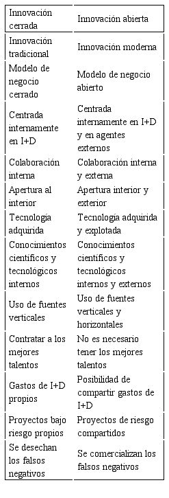 De la Tabla anterior, se puede asumir que la innovación abierta brinda una complementariedad a la innovación tradicionalista cerrada, pero la esencia principal surge a partir de un modelo de negocio con estrategias abiertas de apertura y colaboración, tanto de fuentes internas como externas, la interacción colaborativa y de alianzas, y las nuevas oportunidades para explorar y explotar ideas, el conocimiento y la tecnología que mejoren los resultados innovadores y empresariales, brindando una respuesta rápida al mercado (Chesbrough, 2003, 2006, 2015).