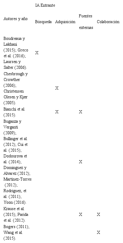 Por las razones anteriores, la mayoría de las empresas adopta la estrategia de IA entrante y recurre a prácticas con fuentes externas, en primera instancia con clientes, usuarios finales, proveedores, intermediarios, rivales y empresas de la misma industria o sector; posteriormente se tiende a vincularse con agentes externos fuera de la cadena productiva, como pueden ser institutos de educación, universidades, empresas de I+D, consultores externos, empresas especializadas en investigación y desarrollo, y gobierno entre otros (Buganza y Verganti, 2009; Bullinger et al., 2012; Cui et al., 2015; Dodourova et al., 2014;Domínguez y Alvarez, 2012;Martínez-Torres, 2012; Rodríguez, et al., 2011; Yoon, 2016).
