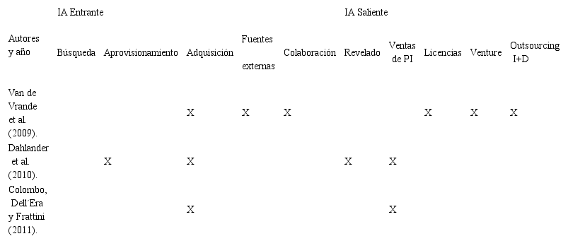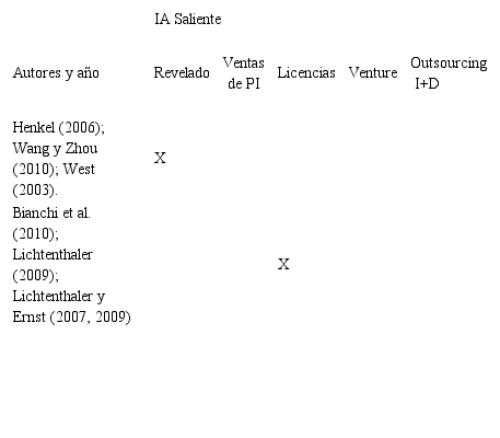 Resulta pertinente hacer la aclaración de que las actividades de revelar conocimientos en la mayor parte de la revisión de literatura ha sido entendida como una práctica, sin embargo, autores como Henkel (2006) denominan al hecho de revelar ideas y conocimientos previamente escondidos en la organización como parte de la dimensión de apertura dentro de la innovación abierta. Por su parte, las prácticas de venture y outsourcing I+D se describen en la estrategia de la IA mixta.
