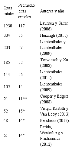 De la Tabla anterior, se muestran los documentos más nombrados, y en la primera columna se puede observar que el artículo más citado es el de Laursen y Salter (2006) con 1230 citas, después de este documento los demás están a menos de una cuarta parte de las veces mencionadas del primero, por lo que se puede resaltar que el primer documento es uno de los relevantes del tema. Con respecto a la segunda columna, al obtener el promedio de citas anuales, al dividir la cantidad de citas totales entre los años vigentes del documento desde su publicación, se encontró que en general existen siete documentos que mantienen su permanencia con respecto a los documentos más citados, sin embargo, se aprecia una tendencia de tres documentos a la alza marcados con un asterisco (*), como son Visnjic Kastalli y Van Looy (2013) relacionados a la innovación abierta en servicios, el autor Berchicci (2013), relacionado a los sistemas abiertos de I+D , y los autores Parida, Westerberg y Frishammar (2012), relacionados a la innovación abierta entrante en las Pyme; y otros documentos a la baja marcados con dos asteriscos (**), como Cooper y Edgett (2008), relacionado a la productividad en el desarrollo de nuevos productos. Vale la pena mencionar, que la ausencia de documentos importantes como los del pionero que acuño el concepto de IA, Chesbrough (2003, 2006), no están considerados puesto que el enfoque de la búsqueda de esta investigación se basó en la innovación abierta con el rendimiento empresarial en conjunto, y no fue una búsqueda unitaria de innovación abierta.