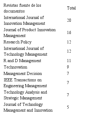 En cuanto a las fuentes principales en donde se publicaron los documentos de innovación abierta y rendimiento empresarial, destacaron la revista International Journal of Innovation Management con 20 publicaciones del tema, la Journal of Product Innovation Management con 16 publicaciones y la revista Research Policy con 12 publicaciones. Cabe mencionar, que la Conferencia anual de las Américas de Sistemas de Información, también fue la fuente más importante en cuanto a publicaciones, pues tan solo en 2012 conto con seis publicaciones y en 2011 con otras cinco publicaciones más.