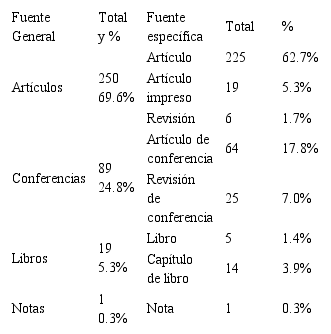 En cuanto a las fuentes principales de donde provienen los documentos publicados, se puede observar que casi el 70% son artículos, casi el 25% provienen de conferencias, y el restante, a excepción de un documento, son libros y capítulos de libro. Vale la pena mencionar, que de los 359 artículos, solo 13 de ellos que representan el 3.6% se encontraron con acceso abierto a todo el documento.