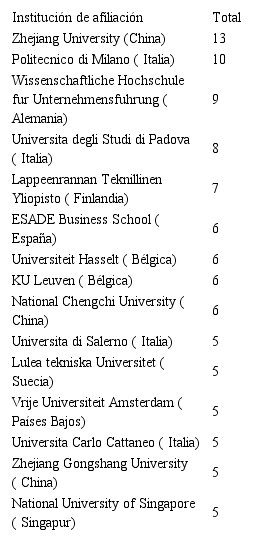 De la Tabla anterior, se puede apreciar que las universidades principales en donde están afiliados los investigadores del tema de estudio se concentran principalmente en Europa y Asia.