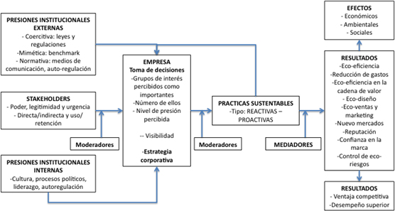 Lo anterior sugiere que los tomadores de decisiones pueden elegir las iniciativas con respecto a su responsabilidad corporativa proactivamente y estratégicamente (Porter y Kramer, 2006; Schaltegger et al., 2012; Orlitzky et al., 2015), lo que contradice el argumento de la existencia de presiones institucionales de isomorfismo que atenúan la lógica estratégica, donde los tomadores de decisiones aprenden respuestas apropiadas y ajustan su comportamiento en consecuencia (DiMaggio y Powell, 1983; Husted y Allen, 2006). Derivado de lo anterior, se postula que el proceso de toma de decisiones media la relación entre las presiones sobre las empresas para adoptar un comportamiento sustentable y las prácticas que deciden adoptar, mientras que los recursos y capacidades organizacionales median la relación entre las acciones adoptadas y los beneficios para la empresa y sus grupos de interés.