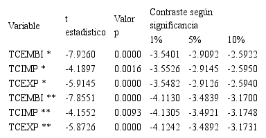 Donde B1 es el intercepto yt es la variable de tendencia. Para cualquiera de los tres casos, la hipótesis nula asume que s=0 , es decir, que p=1 o en otras palabras, que la serie no es estacionaria.La Tabla 1 muestra los resultados de la pruebas de raíz unitaria de las variables bajo estudio, como se puede apreciar los valores sugieren que la totalidad de las variables del modelo son estacionarias. La información presentada se obtiene mediante el paquete econométrico Eviews versión 6.0.