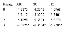 El siguiente paso es identificar el número de rezagos del VAR, obteniendo los resultados mostrados en la Tabla 2.