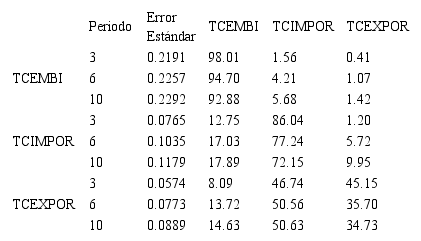 El procedimiento de descomposición de la varianza muestra la contribución marginal de las innovaciones sobre la varianza total, en otras palabras, ofrece la posibilidad de identificar de qué forma contribuye cada shock sobre el error de predicción del sistema VAR(Santander, 2009); lo anterior se puede apreciar a continuación en la Tabla 6: