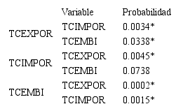 Lo anteriormente expuesto sugiere, además de confirmar la relación eminentemente inversa entre la actividad comercial con el exterior y la prima de riesgo país, las expectativas asociadas al EMBI afectan a la balanza comercial primordialmente a través de las importaciones mientras que las exportaciones son el componente que tienen mayor impacto sobre la prima de riesgo país. Finalmente es preciso destacar que la bondad de ajuste del modelo representado por la ecuación (1) muestra un R-cuadrado corregido de 0.8308, lo cual sumado a la significancia estadística de los coeficientes, permite sugerir que las exportaciones y las importaciones son variables significativas para explicar el comportamiento de la prima de riesgo país en México.