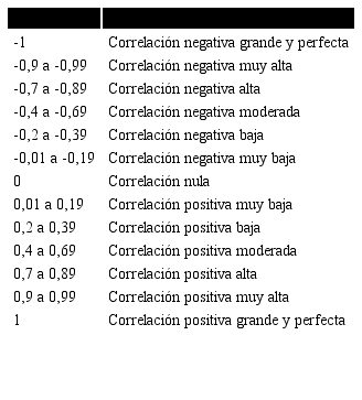 El cálculo aplicado para obtener la confiabilidad se encuentra soportado por valores iterítem del coeficiente de correlación de Pearson (r). El significado para cada valor del coeficiente de correlación se muestra en la tabla 1.