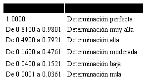El resultado del coeficiente de determinación (r2) indica la varianza de factores comunes. Esto es, el porcentaje de la variación de una variable debido a la variación de la otra variable y viceversa (Hernandez-Sampieri et al., 2004) . Analógicamente, la escala de interpretación del coeficiente de determinación se observa en la tabla 2.