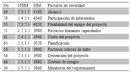 De acuerdo a Suk, Chi, Mulva, Caldas, and An (2017) para mejorar el desempeño de proyectos es necesario identificar los mejores atributos de gestión. En este sentido, los factores más importantes que inciden en cada apartado, se obtuvieron a partir de las respuestas del cuestionario y mediante el índice de severidad de Mendenhall, la tabla 3 muestra los 10 factores más relevantes.