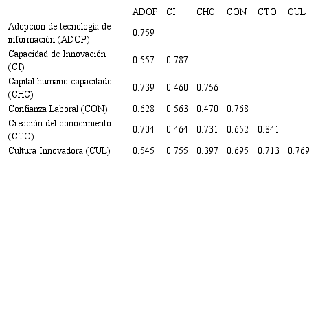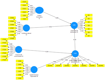 Como parte de los resultados estadísticos se utilizó el modelo de ecuaciones estructurales utilizando en software Smart PLS versión 3 (Hair, Ringle & Sarstedt, 2011). Para efecto de la validez de contenido del instrumento de medición se realizó revisión literaria sobre la adopción de tecnologías de información y la capacidad de innovación. Se realizó adaptación de las escalas de medición con la finalidad de que el encuestado comprendiera a detalle el cuestionario.