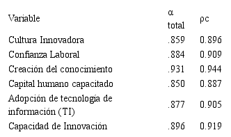 Para la validación del modelo propuesto se realizó la prueba de fiabilidad del constructo a través de la medida de consistencia interna: alfa de Cronbach (α) y coeficiente de fiabilidad compuesta (ρc). De acuerdo con Hair, Ringle & Sarstedt (2011) la unidad de medida de ambas pruebas debería ser 0.70, como se muestra en la tabla 3, se infiere que todas las variables son fiables, por ende, presentan la consistencia interna optima indicada por los autores.