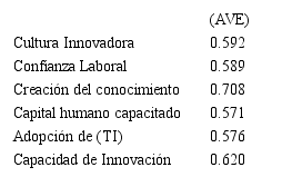 Continuando con la fiabilidad del constructo de las variables objeto de estudio, se determinó la validez convergente del instrumento en mínimos cuadrados parciales (partial least squares, PLS). Esta prueba es determinada por el promedio de la varianza extraída (average variance extracted, AVE). Este coeficiente indica la cantidad de varianza que la variable reflexiva obtiene de los indicadores relacionados con la cantidad de varianza en función al error de medida. En la tabal 4 se nuestra el coeficiente AVE debiendo ser mayor a 0.5 para variables reflexivas Fornell & Larcker (1981). Es decir todas las variables son válidas y explicadas por más del 50%.