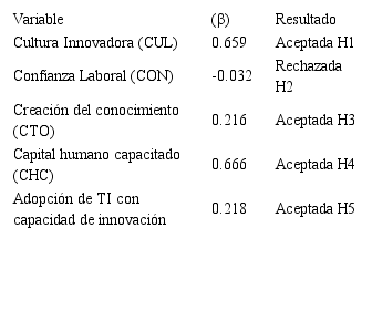 Los resultados muestran que la cultura innovadora influye en la capacidad de innovación siendo estadísticamente significativa (H1 β=0.659), por lo tanto se acepta esta hipótesis y se infiere que el recurso humano que labora dentro de estas empresas mantienen características y personalidades que incentiva la capacidad de innovación Saunila & Ukko (2014), cuentan con valores individuales y colectivos que propician la iniciativa de tomar decisiones para innovar Manual de Oslo (2005), mismas que les permita pensar, percibir y enfrentar los problemas (Baković, Lazibat & Sutić, 2013; Naor et al., 2014).