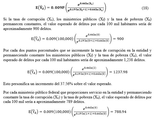 Por cada dos puntos porcentuales que se incrementa la tasa de pobreza en la entidad y permaneciendo constante la tasa de corrupción (Xc) y los ministerios públicos (Xf), el valor esperado de delitos por cada 100 mil habitantes sería de aproximadamente 570 delitos.