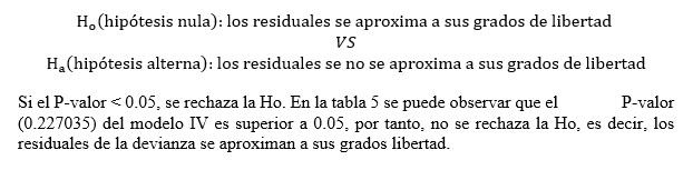 Los residuales de la devianza del modelo IV (tabla 5) se aproximan a sus grados de libertad.