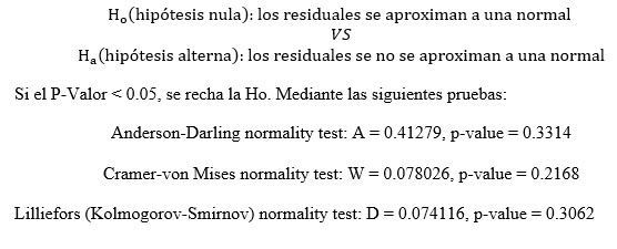 Con estas pruebas de hipótesis, se puede ver que los residuales del modelo se distribuyen como una normal, pues el P-Valor se encuentra por arriba del 0.05.