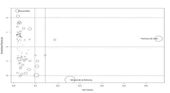 Sin embargo, en la figura 3 se puede ver que hay observaciones que podrían “influir” (Eloxochitlán, Mineral de la Reforma y Pachuca de Soto) sobre la dinámica del fenómeno porque se encuentran en los extremos de muy alta y muy baja incidencia delictiva por tratarse de los municipios más pequeño y más grande del Estado, no obstante, en la figura 4, se puede ver que dichas observaciones no producen sesgo en la predicción del comportamiento del fenómeno delictivo.
