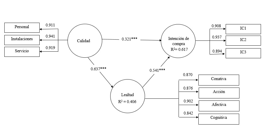 El modelo propuesto aborda la relación de mediación de la lealtad entre la calidad del servicio e intención de compra, por lo que se procedió a su análisis obteniendo así un nuevo modelo mejorado de las relaciones causales. A continuación, se muestra el modelo final. Figura 3.