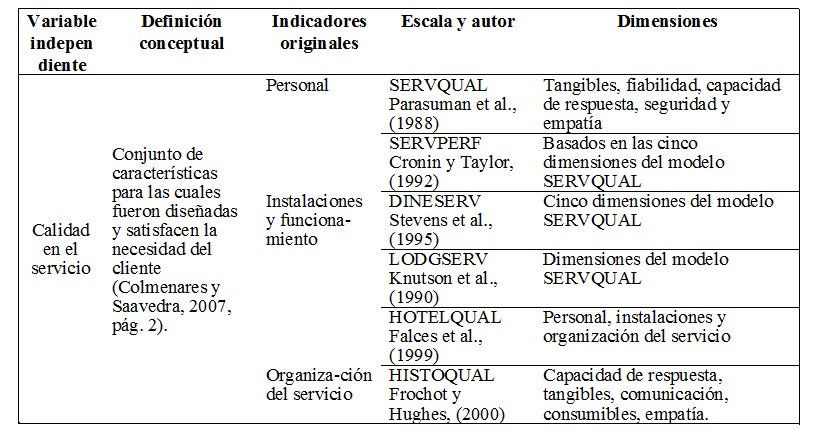 Uno de los modelos teóricos más reportados en la literatura para evaluar la calidad de servicio percibida por el cliente es el SERVQUAL de Parasuraman, Berry y Zeithaml (1988). Los autores explican que la medición de la calidad se da a través de tres dimensiones que son calidad física, corporativa e interactiva. Este se consolida en una plataforma para la para la creación de nuevas propuestas enfocadas en sectores o industrias específicos. Entre las más destacadas para la industria hotelera se encuentran los modelos: LODGSERV, entendido como la expectación del servicio de una experiencia hotelera (Knutson, Stevens, Wullaert, Patton y Yokohama, 1990); LODGQUAL, que también se enfoca a los servicios de alojamiento pero particularmente de cinco estrellas o de lujo (Getty y Thompson, 1994); HOTELSERV, que tiene como objetivo evaluar de forma global la calidad del servicio hotelero basándose en tres factores –empleados, elementos tangibles y fiabilidad- (Wong Ooi Mei, Dean y White, 1999) y finalmente, el modelo HOTELQUAL (Falces, Sierra, Becerra y Briñol, 1999). De origen español y creado en base a la fuerte demanda por parte del sector de alojamiento, el HOTELQUAL se enfoca en tres dimensiones que son personal, instalaciones y organización del servicio (Bonilla, Guerrero y López, 2018). Es el primer modelo desarrollado en español y que integra un factor específico que se enfoca tanto en el funcionamiento como en la organización de los servicios. Adicionalmente, fue utilizado en España para analizar la calidad de los diferentes hoteles representativos de la oferta alojamiento de la Comunidad de Madrid –incluyendo hostales- abarcando un radio mayor de establecimientos de tres estrellas. Como se puede observar en la tabla 1 se define la variable independiente calidad de servicio, así como una comparación de los distintos enfoques de la variable y sus respectivas dimensiones.