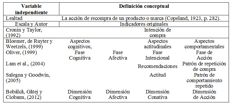 El concepto de lealtad ha cambiado a través del tiempo. La primera conceptualización de lealtad se le atribuye a Copeland (1923) que habla sobre el comportamiento de la recompra como la característica principal de la lealtad. Con el tiempo, el concepto evoluciona y se desarrolla. Algunos enfoques que empieza a tomar la lealtad incluyen el comportamental seguido por el actitudinal (Colmenares y Saavedra, 2007). También, se empiezan a identificar dimensiones más específicas como la calidad del servicio, valor percibido, satisfacción, confianza, compromiso y comportamiento leal y a evaluar los efectos que tiene la calidad en el servicio sobre la lealtad siendo altamente significativos (Wilkins, Merrilees y Herington, 2009). En el caso del modelo Customer Loyalty (Bobâlcă, Gătej y Ciobanu, 2012) se exploran los factores: cognitivo, afectivo, conativo y acción. Finalmente, en la literatura más reciente, se identifica el efecto de la calidad sobre la lealtad, el cual se vuelve más sobresaliente al pasar el tiempo y se retoman las ideas originales sobre el impacto que tiene la calidad del servicio en la industria hotelera sobre la satisfacción y lealtad del cliente, así como de la rentabilidad (El, 2015). Entre otras, la variable de calidad en el servicio se identifica en la literatura como antecedente de la actitud leal. Como consecuencia o resultado se reporta la recomendación y la re compra (Kandampully y Bilgihan, 2015). En la tabla 2 se define la variable independiente lealtad, además, se incluye una comparación de los distintos enfoques y sus respectivas dimensiones.