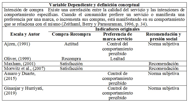 En el caso de la intención de compra –variable derivada de la teoría del Comportamiento Planeado de Ajzen (1991) la cual considera que el comportamiento humano es totalmente voluntario y se encuentra bajo control- se han hecho varias propuestas para su operacionalización y la comprobación de que la intención está correlacionada directamente con la compra con resultados exitosos. La credibilidad y transferibilidad de esta proviene de numerosos estudios correlacionales que muestran la capacidad de la misma para predecir las intenciones y comportamientos de las personas, así como la aceptación de que existen intervenciones que pueden modificar la actitud, la norma subjetiva y el control de comportamiento percibido que se reflejan en las intenciones y posteriormente en el comportamiento de consumo (Ginanjar y Hurriyati, 2019; Amaro y Duarte, 2015). Basándose en la escala publicada originalmente en el libro Handbook of Marketing Scales, ha sido actualizada y adaptada en diferentes contextos como es el caso de la obtenida para este análisis que consta de tres ítems (Morwitz, Steckel y Gupta, 2007; Maxham, 2001). La compra, recompra o recomendación están ligadas en la literatura al concepto de lealtad acuñado por Copeland. Consistencia es lo que caracteriza a una compra leal cuando el consumidor no acepta sustitutos a la hora de hacer la compra de un producto. También, la insistencia de recomprar una cierta marca-producto aun cuando existan esfuerzos mercadológicos externos que lo inviten a adquirir otra. En la tabla 3 se define la variable dependiente de intención de compra y se incluye la comparación de los diversos enfoques y sus dimensiones.