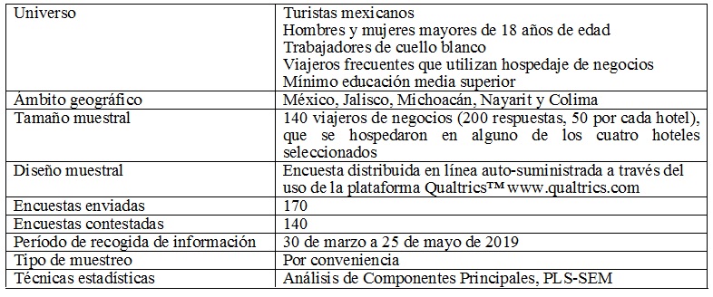 La muestra final fue de 140 viajeros de negocios que contestaron la encuesta auto-suministrada mediante un muestreo por conveniencia en línea, obteniendo de esta manera 200 respuestas sobre la evaluación de cada una de las cadenas de hoteles o 50 respuestas de cada una debido a que, en algunos casos, las personas que viajaron y se hospedaron en dos hoteles, podían responder dos veces, es decir, que se tienen más respuestas porque en la encuesta existe la posibilidad de contestar hasta cuatro veces en función de los hoteles visitados. Entre los estados representados se encuentran México, Jalisco, Michoacán, Nayarit y Colima. La tabla 6 muestra los resultados demográficos de los viajantes de negocios que participaron en la investigación.