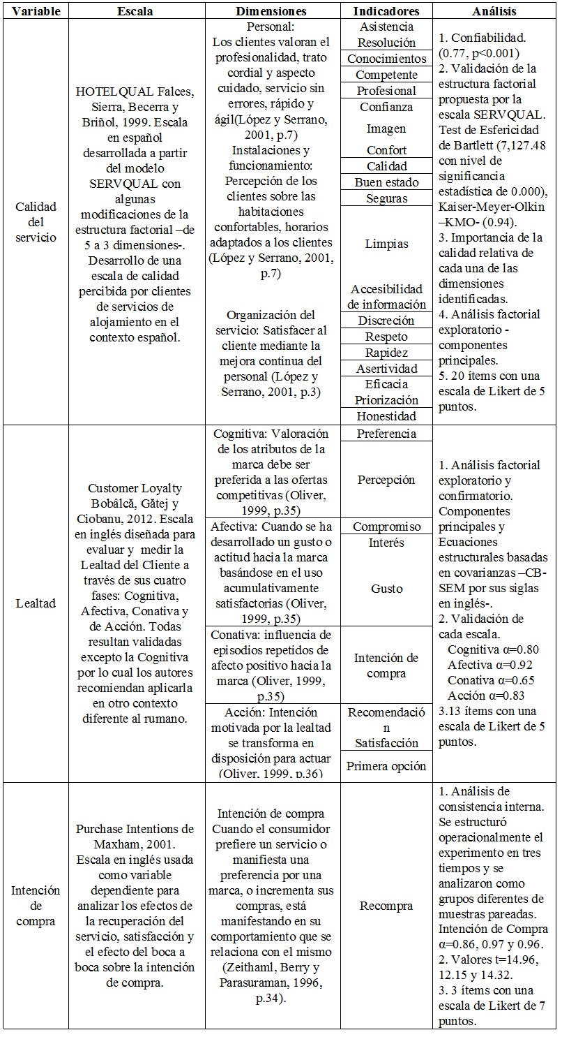 El instrumento de medición se redactó completamente en español. Para la realización del cuestionario final se utilizaron tres escalas propuestas por diferentes autores con sus respectivas dimensiones e ítems validadas exploratoriamente –utilizando técnicas de primera generación como es el caso de MANOVA y pruebas t en el caso de la intención de compra y Análisis de Componentes Principales en el caso de la escala HOTELQUAL- y en el caso de la lealtad del cliente, se validó confirmatoriamente el modelo original en inglés a través del uso de CB-SEM o SEM basado en covarianzas, planteando en esta investigación un enfoque diferente. Para medir la calidad del servicio en hoteles se usó la escala HOTELQUAL desarrollada por Falces Delgado, Sierra Díez, Becerra Grande y Briñol Turnes (1999). Esta escala se divide en tres áreas diferenciadas: personal, instalaciones y funcionamiento, y organización del servicio, dando como resultado un total de 20 ítems para la medición de las tres áreas sin cambios. Para medir la lealtad del cliente se utilizó la escala Service Loyalty Measurement Scale (Bobâlcă, Gătej y Ciobanu, 2012) que se divide en cuatro dimensiones: Cognitiva, Afectiva, Conativa y Acción y que se conforma por 13 ítems. Por último, para la medición de la intención de compra se utilizan 3 ítems que sirven para valorar la intención inmediata y futura de compra (Maxham, 2001). En la tabla 7 se muestra la propuesta operacional de las variables.