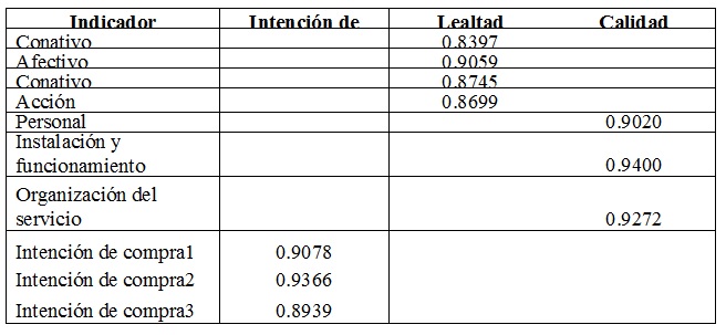 El residual de raíz promedio estandarizado –SRMR- arrojó un resultado de 0.06. Por su parte, en la varianza extraída –AVE- se obtuvieron los siguientes datos: intención de compra 0.83, lealtad 0.76 y calidad 0.85, aprobando la validez convergente. El análisis de consistencia interna da como resultado los valores de los coeficientes de Alfa de Cronbach siguientes para cada constructo: intención de compra 0.89, lealtad 0.89 y calidad 0.91, indicadores confirmatorios de la estructura factorial propuesta. En la validez discriminante –HTMT- se obtuvieron datos inferiores a 1; lealtad -> intención de compra 0.82, intención de compra -> calidad 0.72 y lealtad -> calidad 0.69. Obteniendo así la aprobación del modelo. Prosiguiendo, las cargas de confiabilidad compuesta se agrupan en debido orden y se encuentran por arriba de 0.8 para ser aceptados como se muestra en la tabla 8.