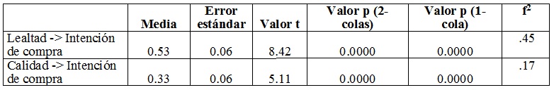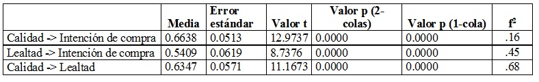 El residual de raíz promedio estandarizado –SRMR-, se mantuvo en 0.06. Por su parte, en la varianza extraída -AVE- se obtuvieron los siguientes datos: intención de compra 0.85, lealtad 0.76 y calidad 0.83, los cuales se mantienen igual que la anterior. El análisis de consistencia interna da como resultado los valores de Alfa de Cronbach de cada dimensión siguientes: intención de compra 0.91, lealtad 0.89 y calidad 0.83. En la validez discriminante -HTMT- se obtuvieron datos anteriores inferiores a 1. El siguiente resultado obtenido fue el de coeficiente de determinación de lealtad R2 = 0.40 y de intención de compra R2 = 0.61 lo que significa que ambas relaciones son sustanciales. El efecto de la calidad de servicio es altamente significativo sobre la intención de compra al explicar un 32% de la varianza, mientras que para la lealtad es igualmente significativo explicando un 63% lo mismo que la lealtad hacia la intención de compra explicando un 54%. En la tabla 10, que se muestra a continuación se reportan los valores de t, los valores p para una y dos colas y los tamaños de efecto f2 para la confirmación de hipótesis presentadas al inicio de esta investigación, obteniendo resultados altos y confirmatorios por parte de las dos variables independientes y la mediación de la lealtad sobre calidad de servicio.