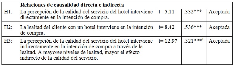 Estos resultados evidencian la mejoría del modelo estructural al arrojar altas cargas de los valores de t en comparación a la propuesta previa, por lo que el modelo de la mediación de la lealtad es el mejor, como se propone en la literatura donde se indica el efecto que tiene la calidad del servicio sobre la lealtad (Ashraf, Ilyas, Imtiaz y Ahmad, 2018; Gracia, Bakker y Grau, 2011) y a su vez el efecto que tiene la lealtad sobre la intención de compra (Choi, Ko y Kim, 2016; Bloemer, De Ruyter y Wetzels, 1999). Por último, se logra la aprobación de las hipótesis con las 3 propuestas sobre causalidad directa e indirecta. Figura 11.