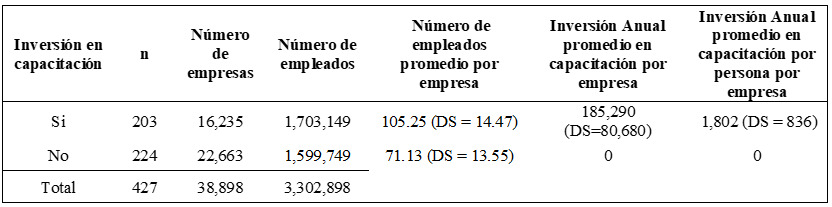 El total de la muestra de estudio se integra a partir de la información de 427 muestras independientes de pequeñas y medianas empresas de la industria manufacturera, que reportaron invertir y no invertir en capacitación. El número total de unidades económicas encuestadas y de sus empleados respectivos analizados en las distintas 427 muestras fueron 38,898 y 3,302,898 respectivamente. En razón del objetivo de la presente investigación se dividieron los resultados en dos grandes grupos: Si invirtieron en capacitación y No invirtieron en capacitación. Se identificó que el 58.26 % de los establecimientos no invirtió en capacitación, mientras que el 41.74 % si lo hizo. Por otra parte, se observó que el número de empleados en los establecimientos que si capacitaron fue significativamente mayor (t=25.07, p < 0.05).