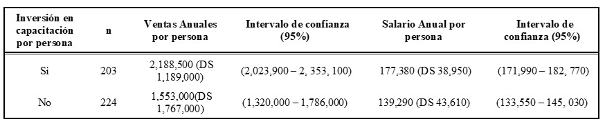Tanto el promedio anual de ventas por persona, así como el de sueldos por persona son mayores para los establecimientos que invirtieron en capacitación (véase tabla 2), y estas diferencias resultaron estadísticamente significativas (para sueldos t = 9.53, p(2.2e-16)<0.05, y para ventas t=4.39, p(1.43e-05)<0. 05).