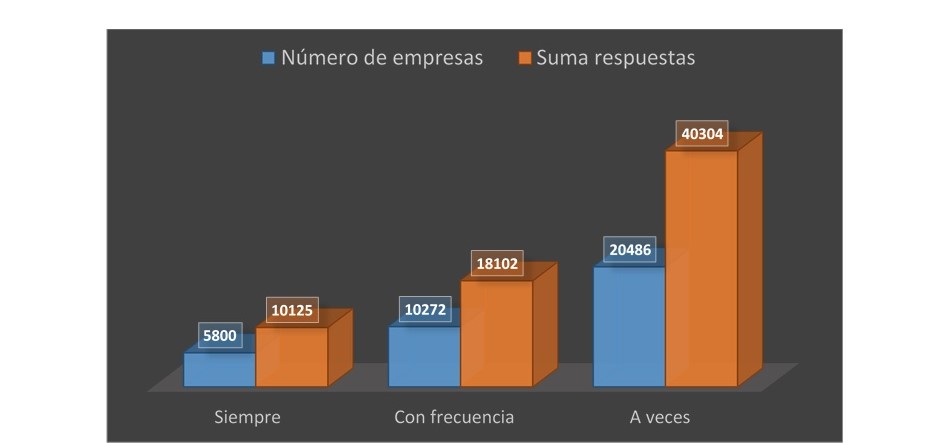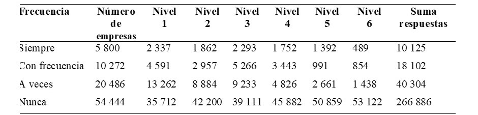 A continuación, en la Tabla 2 se muestran el número de empresas de acuerdo a la frecuencia con la que realizan alguna de las actividades de madurez tecnológica definidas en los seis niveles anteriores en la encuesta ESIDET 2017.