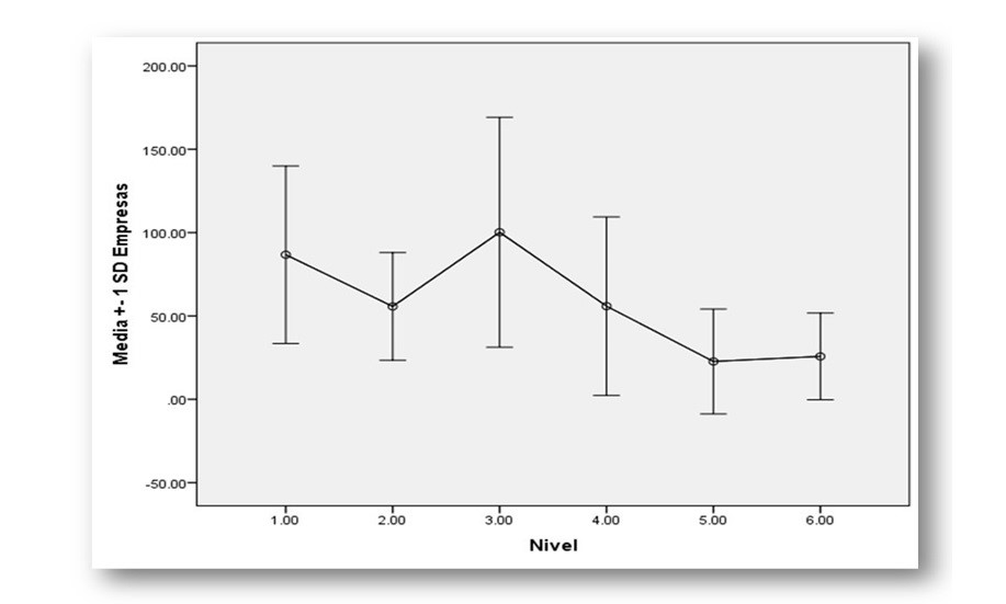 b) Falta de progresividad. Tiene inconsistencias en el orden de progresividad de los niveles. Asumiendo que la escala tiene una lógica progresiva, es incongruente que se tenga un número mayor de empresas en el nivel 3 que en el 2 en los tres casos de frecuencias. El análisis de correlación muestra esta inconsistencia. De la misma forma, esta inconsistencia no es congruente con la teoría de las escalas ordinales de Stevens (1946), antes mencionada, por romper con el principio del orden monótonamente creciente propio de las escalas ordinales.