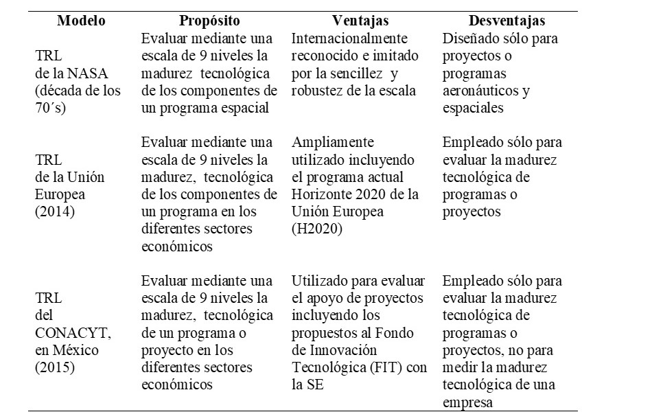 El modelo que mayor reconocimiento y difusión internacional ha tenido para medir la preparación o disponibilidad tecnológica en las diferentes etapas de un programa o proyecto, es la escala de nueve niveles TRL (del inglés Technological Readiness Level), método diseñado por la Administración Nacional de la Aeronáutica y del Espacio (NASA por sus siglas en inglés), de los E.U.A. en la década de los 70’s, para proyectos o programas en el ámbito aeronáuticos y espaciales (Mihaly, 2017).