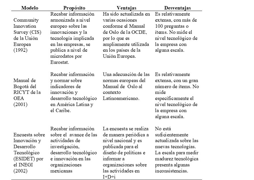 1. Se muestra un panorama general resumido de los modelos internacionales orientados a evaluar el avance tecnológico desde tres diferentes perspectivas: i) evaluar la madurez tecnológica de los programas o proyectos; ii) evaluar a nivel de la empresa individual el avance en la gestión tecnológica; iii) evaluar a nivel de encuestas masivas el avance en la gestión tecnológica. Esta última perspectiva corresponde al de la encuesta ESIDET del INEGI, en la que se centra el análisis.