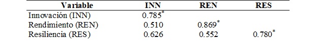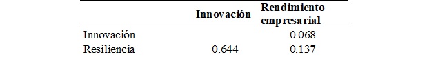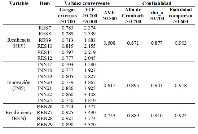 Para la validación de constructos, se analizó la influencia de la resiliencia sobre la innovación y el rendimiento, la influencia de la innovación en el rendimiento y la mediación de la innovación en la relación resiliencia-rendimiento. Se acudió a la modelación de ecuaciones estructurales por mínimos cuadrados parciales (PLS-SEM, por sus siglas en inglés) (Hair et al., 2021). Se eligió la técnica PLS-SEM dada su fortaleza centrada en la predicción y por su flexibilidad al no exigir supuestos paramétricos rigurosos, principalmente en la distribución de los datos. Se usó el software estadístico SmartPLS versión 3.3.3 (Ringle et al., 2015).