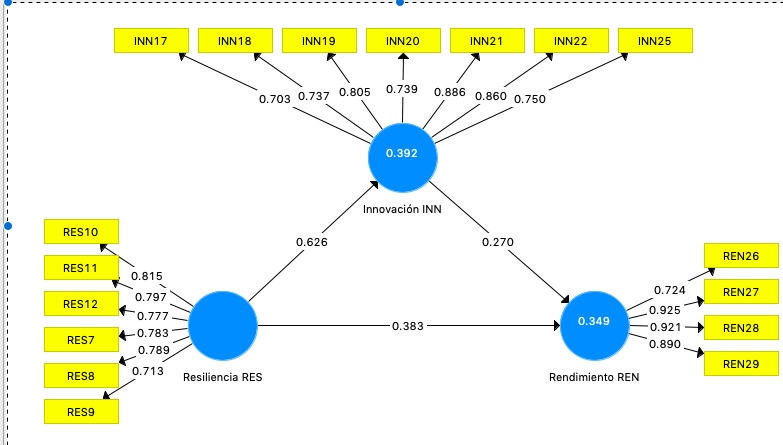 Finalmente, la modelación de ecuaciones estructurales por mínimos cuadrados parciales (PLS-SEM) permitió identificar un modelo de mediación de la innovación en la relación resiliencia-rendimiento empresarial. La resiliencia representa una oportunidad para las PYME para una superación más rápida de las consecuencias adversas de la crisis. El papel que juega la innovación en esa relación se interpreta como un eslabón que envuelve procesos permanentes de cambio y renovación de competencias que persiguen la congruencia con el entorno empresarial cambiante para generar mayor valor a la organización.