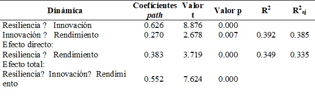Finalmente, el efecto mediador fue complementario parcial, su valor contabilizado de 69.38% defiende la inclusión de la innovación como una capacidad dinámica que emana de decisiones resilientes y guía al éxito empresarial.