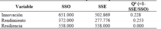 Para valorar la relevancia predictiva del modelo se generó el procedimiento de blindfolding (Stone, 1974), a una distancia de omisión de siete casos (D=7). La tabla 6, muestra que los valores Q2 de redundancia (por sus siglas en inglés: cross validated redundancy) están por encima de cero para los constructos endógenos, lo que brinda apoyo para la precisión predictiva del modelo (Hair et al., 2021). Los valores: 0.02 pequeño, 0.15 medio y 0.35 grande (Hair et al., 2021; Stone, 1974). La tabla 7 presenta una predicción media (valores entre 0.2275 y 0.2533)