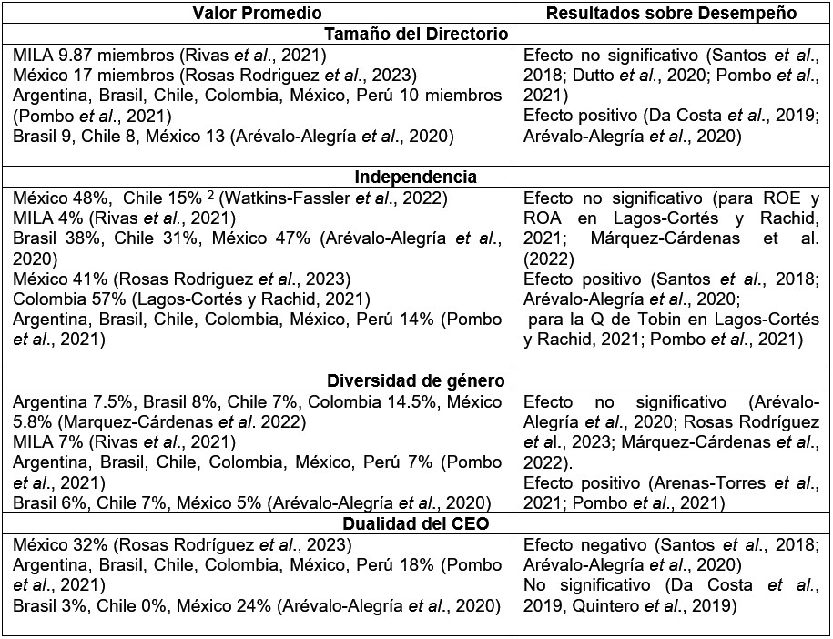 Sobre las características mencionadas previamente se encuentran distintos estudios que analizan su relevancia empírica para Latinoamérica. Resulta relevante conocer los antecedentes para esta región, ya que se trata de economías emergentes caracterizadas por lagunas institucionales (Brenes et al., 2020), lo que resulta en un entorno con poca protección para los accionistas minoritarios (Brenes et al., 2019). La mayoría de los antecedentes plantean estudios cuantitativos sobre las características del directorio y su relación con el desempeño de la empresa, medido en términos contables (ROE, ROA) o de mercado (Q de Tobin). Como puede observarse en la Tabla 1, la evidencia respecto al tamaño del directorio muestra resultados divergentes. Con respecto a la dualidad del CEO, la evidencia es no significativa o de efecto negativo, En cambio, para la independencia y participación femenina los estudios muestran resultados positivos o no significativos.