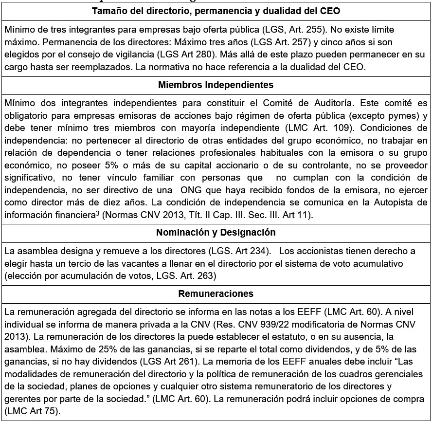 La duración máxima de los directores en su cargo es de tres años, pero a pesar de estos límites normativos, dado que existe una prórroga indefinida tácita, en la práctica se observa que la antigüedad promedio de los directores en sus puestos es de diez años (CNV, 2019b). Por otro lado, en la normativa no existen referencias a la dualidad del CEO. La información sobre remuneraciones es pública solo en forma agregada, pero no a nivel individual como en otros países. La administración de riesgos se menciona como función del Comité de Auditoría, el único comité obligatorio para emisoras de acciones.
