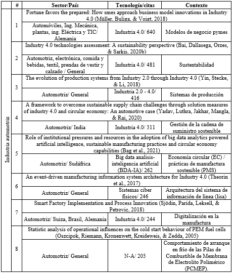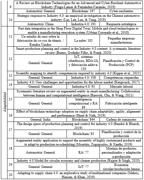 Es importante resaltar los artículos más referenciados en los tres análisis, dado que su reconocimiento como fuentes de consulta por otros investigadores sugiere que ofrecen información de gran relevancia en relación con los temas abordados. Dentro de los primeros 29 artículos más relevantes, se destacan investigaciones enfocadas a las PYMES (pequeñas y medianas empresas) en el contexto de la industria 4.0 donde se aborda como esta afecta la creación del valor, su captura y oferta (Müller et al., 2018) o cómo influye en la creación de productos inteligentes (Urbina et al., 2018), inlcuso como se busca la creacion de un marco conceptual y un sistema de trabajo ciber físico (Sanders et al,, 2016), además de comparativas con empresas multinacionales (Horváth & Szabó, 2019). para estas PYMES, sin embargo, tambien vemos como el tamaño y naturaleza de la empresa no aumentan el uso de teccnologias de produccion avanzada en el caso de la industria automotriz en China (Lin et al., 2018).