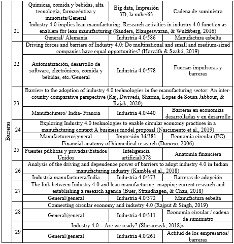 En la actualidad, se realizan diversos estudios para identificar las barreras que afectan la adopción de nuevas tecnologías en diferentes contextos. La detección de estas barreras es crucial para el éxito de los proyectos de implementación de la industria 4.0 (Saatçioğlu et al., 2019). Se observan investigaciones con un enfoque hacia la economía circular, donde se incluyen barreras referentes a la gestión del conocimiento, financieras o tecnológicas (Trevisan et al., 2023) asimismo, bajo el contexto de implantación donde destaca el liderazgo como barrera principal (Govindan & Arampatzis, 2023). Por tal motivo es importante considerar las barreras para el estado del arte, puesto que el superar las barreras es el camino para la implementación exitosa de la I4.0 (Kamble et al., 2018), dado que, nos da una guía de las tendencias que tienen los investigadores referentes a las barreras, brindando un punto de partida para las futuras investigaciones.