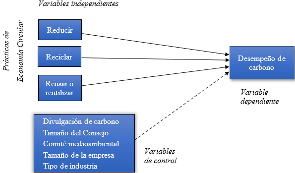 El análisis de los artículos científicos revisados para este estudio consolida las variables que componen el modelo econométrico. Con respecto a la divulgación de carbono, existen mecanismos para determinar su desempeño (Lopes de Sousa Jabbour et al., 2021), lo cual contribuye a la reputación social empresarial (Reyna-Castillo et al., 2023). En relación con las prácticas de Economía Circular, se evalúa la viabilidad financiera de su adopción (McDougall et al., 2022), lo que permite determinar el tipo de industria capaz de implementarlas, como aquellas empresas de la BMV por su capacidad técnico-financiera.