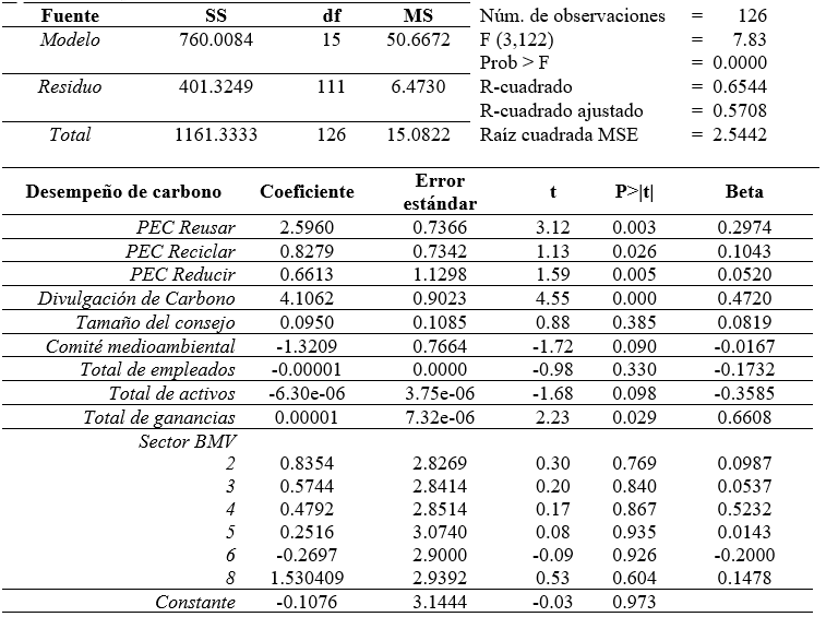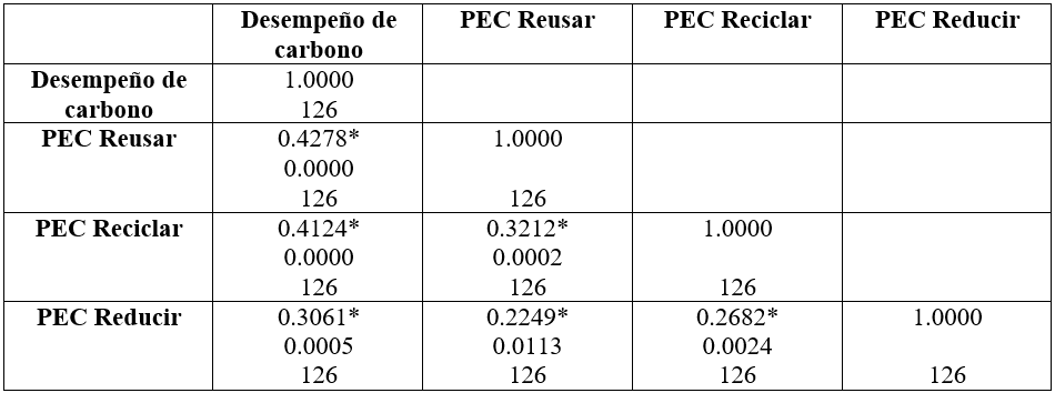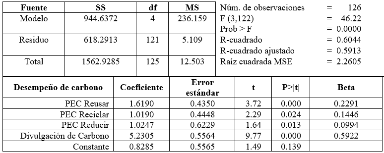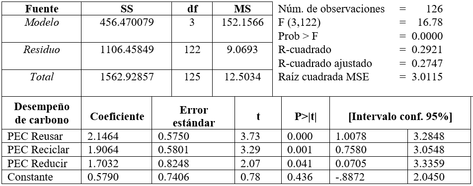En la Tabla 2, se observa que la relación entre las emisiones de carbono y las prácticas de Reusar, Reciclar y Reducir es significativa y positiva. Esta relación será interpretada en la Tabla 4 (Tabla del ANOVA), ya que en la Tabla 3 no se muestran los coeficientes de la relación entre variables (Wooldridge, 2010a).