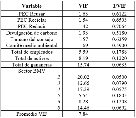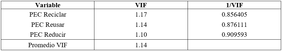 A pesar de que no es estrictamente necesario, en la Tabla 3 se mostró la prueba de no colinealidad entre las variables independientes (Prácticas de Economía Circular: Reducir, Reusar y Reciclar). Para validar el modelo, mejorar la precisión y estabilidad de los coeficientes estimados, facilitar la interpretación de los resultados, y garantizar conclusiones sólidas y confiables, además de demostrar transparencia y credibilidad en el proceso de análisis, se presenta en la Tabla 6 el test de colinealidad de las variables independientes y de control. En esta tabla se observa que no existe colinealidad entre las variables (Collier, 2015).